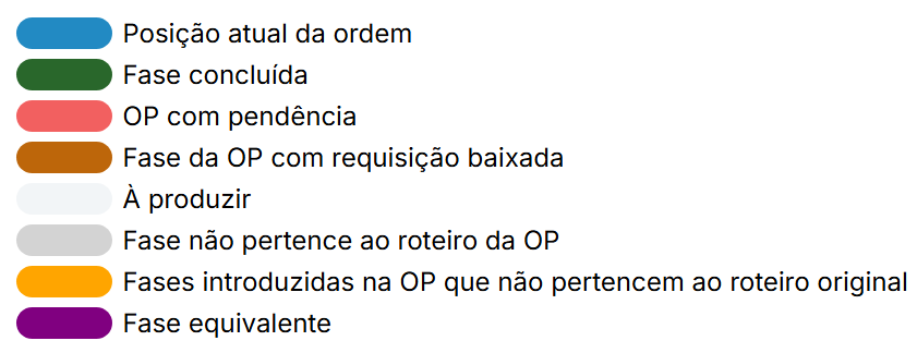 - Verde: fase concluída. - Azul: posição atual da ordem. - Branco: à produzir. - Cinza: fase não pertence ao roteiro da OP. - Laranja: fases introduzidas na OP que não pertencem ao roteiro original. - Roxo: fase equivalente. - Vermelho: OP com pendência. - Amarelo: fase da OP com requisição baixada. Somente serão apresentadas em Amarelo as fases posteriores a fase atual da OP com requisição baixada.