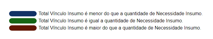 A cor da célula é alterado para indicar a situação do vínculo, de acordo com a legenda: Azul: Total Vínculo Insumo é menor do que a quantidade de Necessidade Insumo. Verde: Total Vínculo Insumo é igual a quantidade de Necessidade Insumo. Vermelho: Total Vínculo Insumo é maior do que a quantidade de Necessidade Insumo.