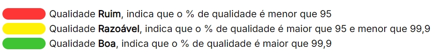 Exibe o percentual de qualidade produtiva do apontamento de baixa da OF na máquina. Seu valor nunca poderá ser maior que 100%. Dessa forma, o grid será apresentado com a cor correspondente ao percentual, conforme regra abaixo: - Vermelho: qualidade "Ruim", indica que o % de qualidade é menor que 95; - Amarelo: qualidade "Razoável", indica que o % de qualidade é maior que 95 e menor que 99,9; - Verde: qualidade "Boa", indica que o % de qualidade é maior que 99,9.