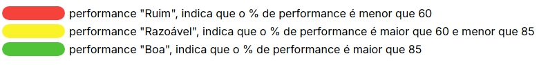 Exibe o percentual de eficiência produtivo do apontamento de baixa da OF na máquina. Quando seu valor for maior que 100%, indica que o tempo padrão de produção no cadastro da engenharia está muito alto, comparado ao tempo de produção apontado. Dessa forma, o grid será apresentado com a cor correspondente ao percentual, conforme regra abaixo: - Vermelho: performance "Ruim", indica que o % de performance é menor que 60; - Amarelo: performance "Razoável", indica que o % de performance é maior que 60 e menor que 85; - Verde: Verde: performance "Boa", indica que o % de performance é maior que 85.