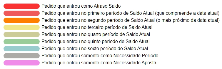Exibe a data de previsão de entrega. Ao programar para pedido, a cor de fundo da data de previsão do pedido é alterada. A cor é definida pelo período e coluna que o pedido se encaixou no grid do programa Planejamento Têxtil (CCTTGP255), conforme abaixo: