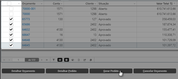 Clique para selecionar um ou mais registros e realizar a ação desejada, como por exemplo, gerar vários pedidos de uma só vez.