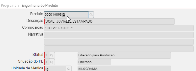 Ao digitar um código de produto, o mesmo será formatado para indicar o código de PE (Processo Específico) liberado do produto.
